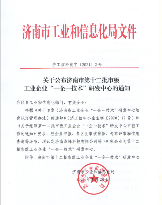 4月20日,濟南市工業(yè)和信息化局官網(wǎng)發(fā)布濟南市第十二批市級工業(yè)企業(yè)“一企一技術”研發(fā)中心名單,山東CA成功獲得認定。