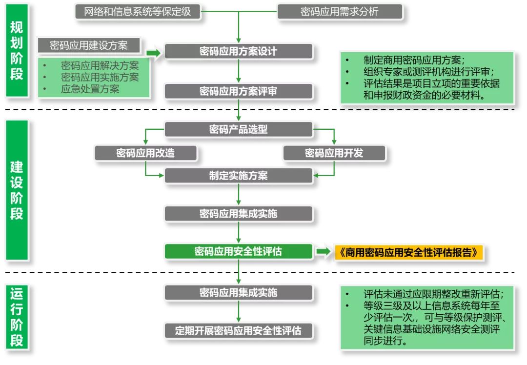 第三級(jí)以上網(wǎng)絡(luò)運(yùn)營(yíng)者應(yīng)在網(wǎng)絡(luò)規(guī)劃、建設(shè)和運(yùn)營(yíng)階段,按照密碼應(yīng)用安全性評(píng)估辦法和相關(guān)標(biāo)準(zhǔn),委托密碼應(yīng)用安全性測(cè)評(píng)機(jī)構(gòu)開展密碼應(yīng)用安全性評(píng)估。網(wǎng)絡(luò)通過評(píng)估后,方可上線運(yùn)行,并在投入運(yùn)行后,每年至少組織一次評(píng)估。密評(píng)結(jié)果應(yīng)當(dāng)報(bào)受理備案的公安機(jī)關(guān)和所在地設(shè)區(qū)市的密碼管理部門備案。