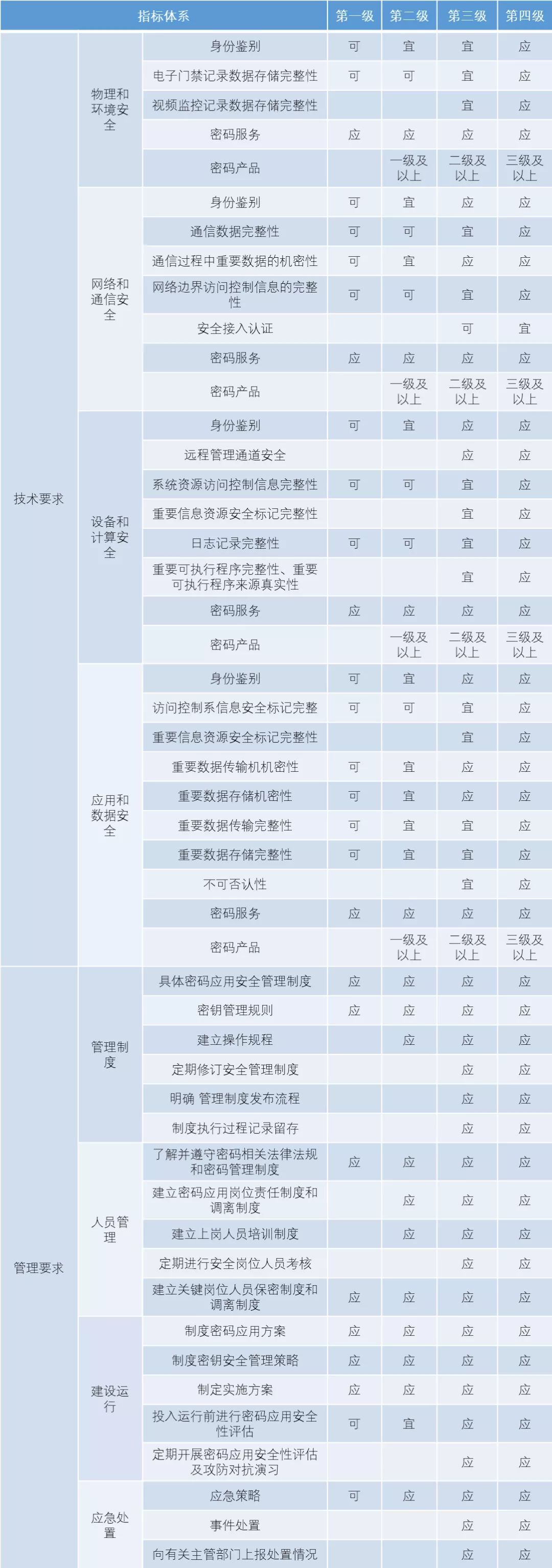 (注:信息系統(tǒng)所應(yīng)遵循的密碼應(yīng)用等級(jí),目前是參照等保定級(jí)的。信息系統(tǒng)根據(jù)GB/T 22240—2020《信息安全技術(shù)網(wǎng)絡(luò)安全等級(jí)保護(hù)定級(jí)指南》完成定級(jí)備案后,其密碼應(yīng)用等級(jí)也相應(yīng)確定,即等保定級(jí)為第一級(jí)的對(duì)應(yīng)第一級(jí)密碼應(yīng)用基本要求,等保定級(jí)為第二級(jí)的對(duì)應(yīng)第二級(jí)密碼應(yīng)用基本要求,以此類推。)