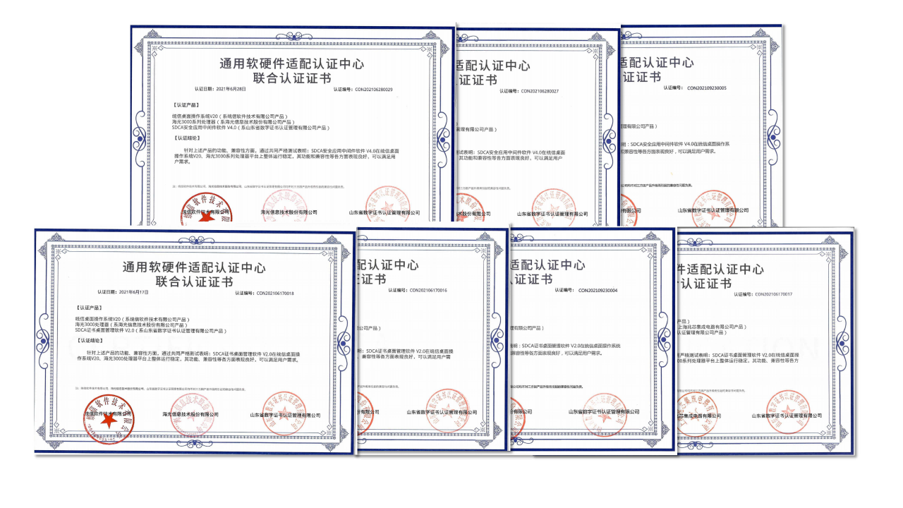 近日,經(jīng)過多次的嚴(yán)格聯(lián)合測試后,山東CA旗下的SDCA安全應(yīng)用中間件系列、SDCA桌面管理軟件系列分別獲得麒麟軟件在飛騰、鯤鵬、龍芯、兆芯、海光等5個國產(chǎn)處理器平臺上的NeoCertify認(rèn)證,并與統(tǒng)信桌面操作系統(tǒng)V20在飛騰、鯤鵬、龍芯、兆芯、海光、海思等6個國產(chǎn)芯片廠商9款處理器平臺上完成了通用軟硬件適配認(rèn)證。測試表明,山東CA上述產(chǎn)品與銀河麒麟及中標(biāo)麒麟桌面操作系統(tǒng)、統(tǒng)信桌面操作系統(tǒng)V20在主流國產(chǎn)處理器平臺上運(yùn)行穩(wěn)定,能夠達(dá)到通用兼容性要求及性能、可靠性要求,滿足用戶的關(guān)鍵性應(yīng)用需求。