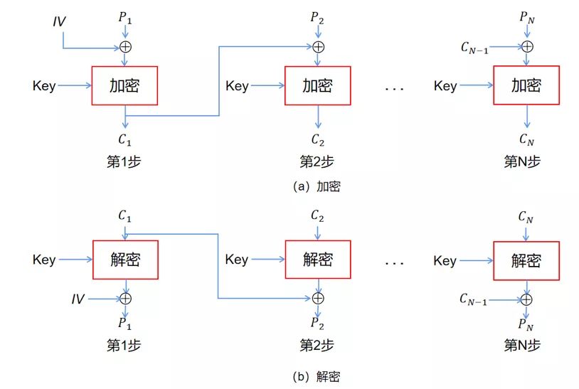 分組鏈接模式:在CBC模式中,首先將明文分組與前一個密文分組進(jìn)行XOR運算,然后再進(jìn)行加密。密文分組像鏈條一樣相互連接在一起(圖4)。