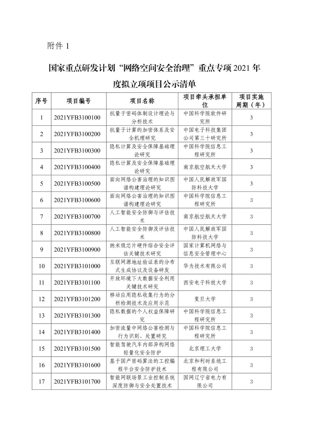 附件:國家重點研發(fā)計劃“網絡空間安全治理”重點專項2021年度擬立項項目公示清單