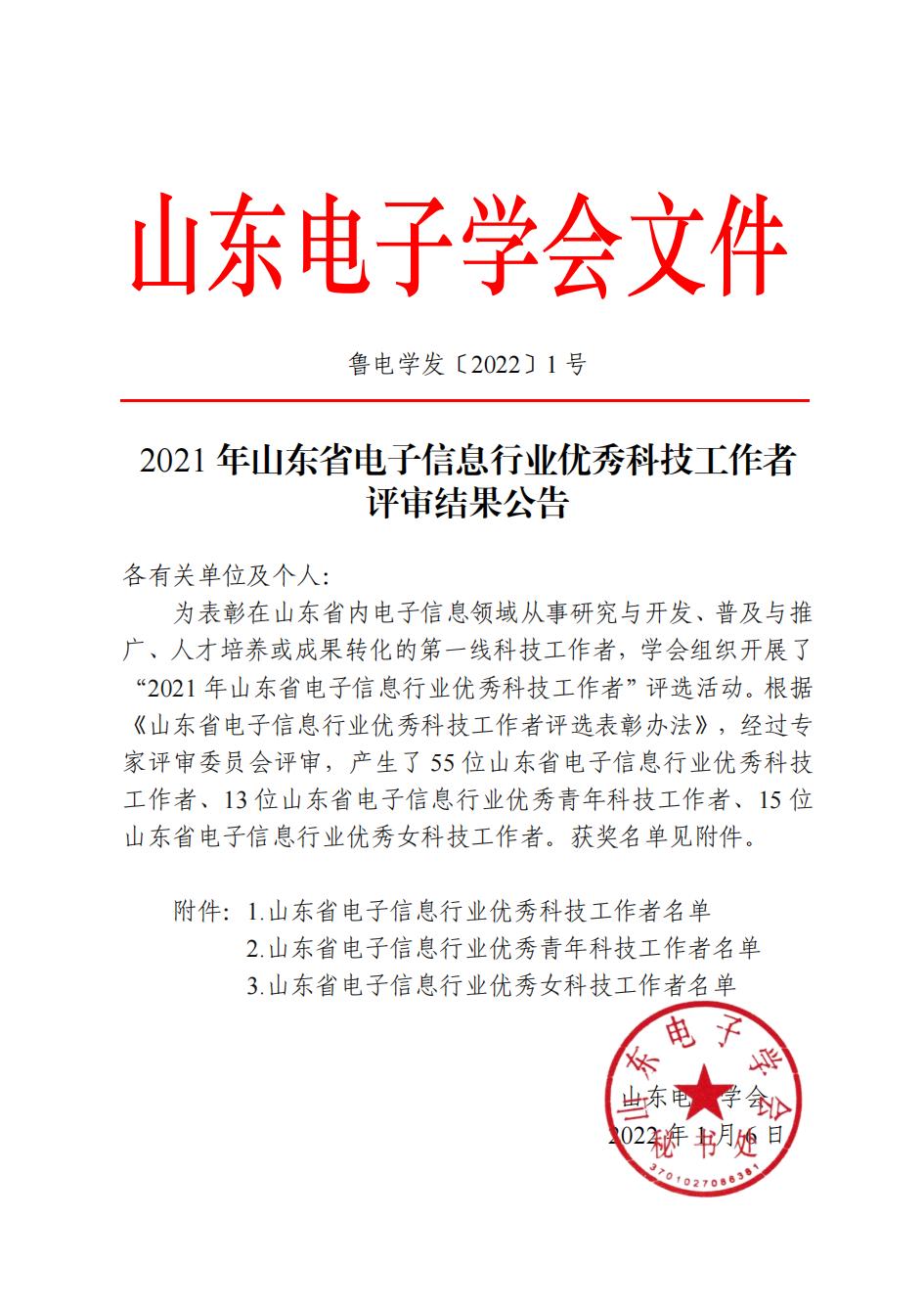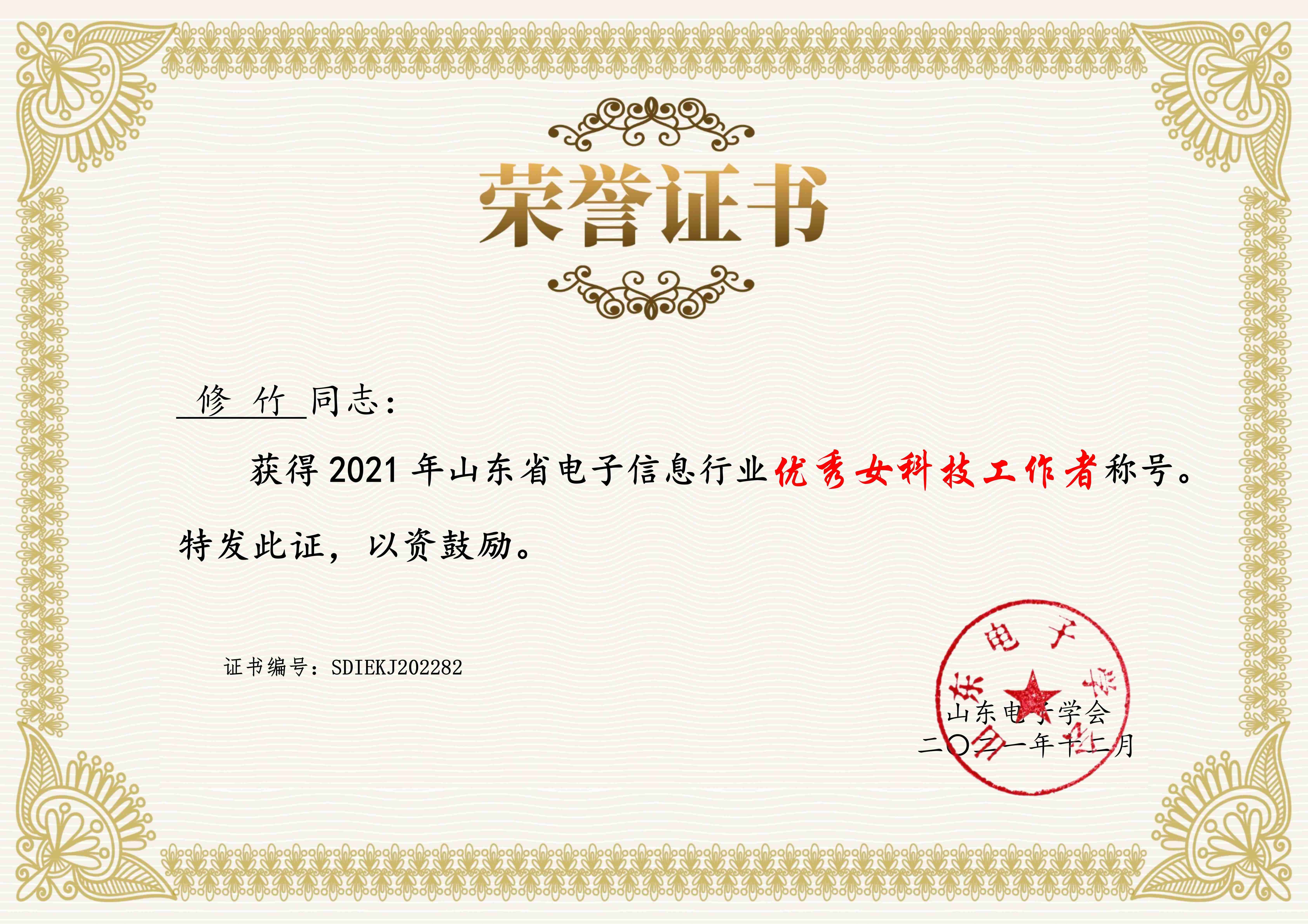 熱烈祝賀我公司修竹同志榮獲2021年山東省電子信息行業(yè)優(yōu)秀女科技工作者榮譽(yù)稱(chēng)號(hào)