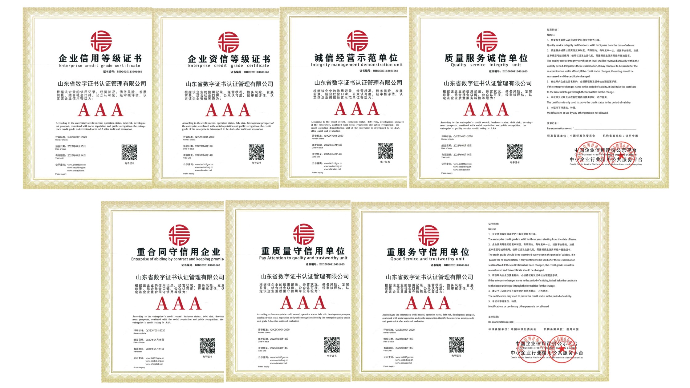 近日,經(jīng)山東CA委托權(quán)威信用評(píng)價(jià)機(jī)構(gòu)依據(jù)Q/JXKC001-2018企業(yè)信用評(píng)價(jià)標(biāo)準(zhǔn)進(jìn)行信用評(píng)價(jià),從單位經(jīng)營(yíng)主體、信用制度建設(shè)、從業(yè)基礎(chǔ)、從業(yè)守信、從業(yè)榮譽(yù)、從業(yè)業(yè)績(jī)和企業(yè)社會(huì)責(zé)任等方面進(jìn)行全方位的評(píng)價(jià)認(rèn)定,山東CA獲評(píng)信用等級(jí)為AAA級(jí),誠(chéng)信管理級(jí)別為A,展望為穩(wěn)定。4月15日,中國(guó)企業(yè)信用評(píng)價(jià)公示平臺(tái)、中小企業(yè)行業(yè)信用公共服務(wù)平臺(tái)聯(lián)合為山東CA頒發(fā)了“企業(yè)信用等級(jí)”、“企業(yè)資信等級(jí)”、“企業(yè)誠(chéng)信經(jīng)營(yíng)示范單位等級(jí)”、“企業(yè)質(zhì)量服務(wù)誠(chéng)信等級(jí)”、“企業(yè)重合同守信用等級(jí)”、“企業(yè)重質(zhì)量守信用等級(jí)”、“企業(yè)重服務(wù)守信用等級(jí)”等七項(xiàng)AAA級(jí)證書。