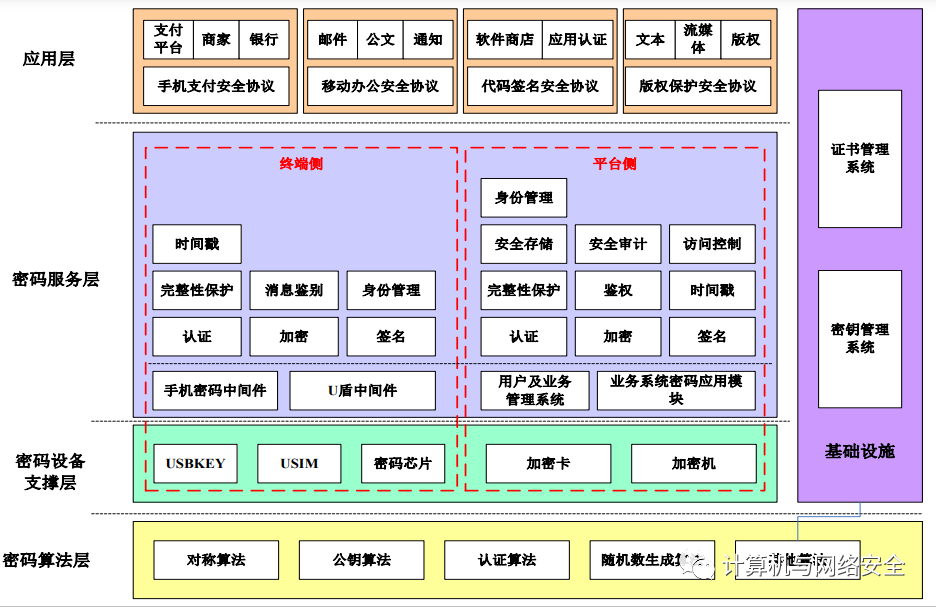 密碼技術(shù)是實(shí)現(xiàn)內(nèi)生安全的核心和基礎(chǔ),整體貫穿硬件(芯片)平臺(tái)、操作系統(tǒng)、應(yīng)用服務(wù)器(中間件平臺(tái))、業(yè)務(wù)應(yīng)用系統(tǒng)各個(gè)層次,密碼技術(shù)應(yīng)用需從系統(tǒng)規(guī)劃設(shè)計(jì)開始,盡量滿足各個(gè)層次的密碼安全設(shè)計(jì)要求。