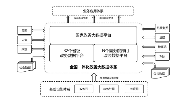 全國(guó)一體化政務(wù)大數(shù)據(jù)體系包括三類平臺(tái)和三大支撐。三類平臺(tái)為“1+32+N”框架結(jié)構(gòu)。“1”是指國(guó)家政務(wù)大數(shù)據(jù)平臺(tái),是我國(guó)政務(wù)數(shù)據(jù)管理的總樞紐、政務(wù)數(shù)據(jù)流轉(zhuǎn)的總通道、政務(wù)數(shù)據(jù)服務(wù)的總門戶;“32”是指31個(gè)省(自治區(qū)、直轄市)和新疆生產(chǎn)建設(shè)兵團(tuán)統(tǒng)籌建設(shè)的省級(jí)政務(wù)數(shù)據(jù)平臺(tái),負(fù)責(zé)本地區(qū)政務(wù)數(shù)據(jù)的目錄編制、供需對(duì)接、匯聚整合、共享開放,與國(guó)家平臺(tái)實(shí)現(xiàn)級(jí)聯(lián)對(duì)接;“N”是指國(guó)務(wù)院有關(guān)部門的政務(wù)數(shù)據(jù)平臺(tái),負(fù)責(zé)本部門本行業(yè)數(shù)據(jù)匯聚整合與供需對(duì)接,與國(guó)家平臺(tái)實(shí)現(xiàn)互聯(lián)互通,尚未建設(shè)政務(wù)數(shù)據(jù)平臺(tái)的部門,可由國(guó)家平臺(tái)提供服務(wù)支撐。三大支撐包括管理機(jī)制、標(biāo)準(zhǔn)規(guī)范、安全保障三個(gè)方面。